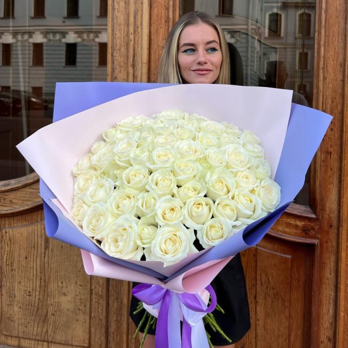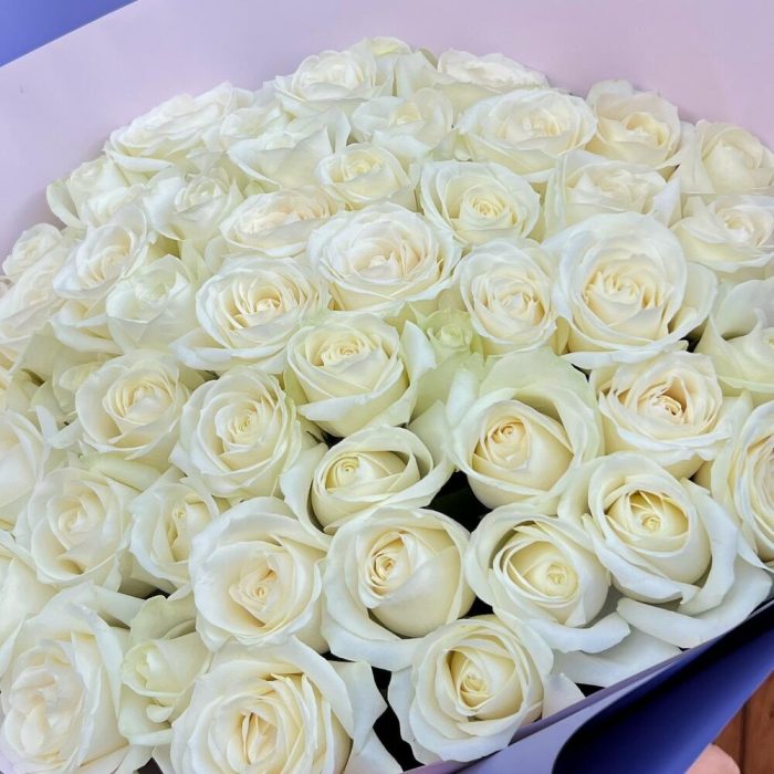 Роза белая 60 см – 65 шт.Дизайнерская упаковка – 5 шт.Тишью – 1 шт.Лента атласная – 2 шт.